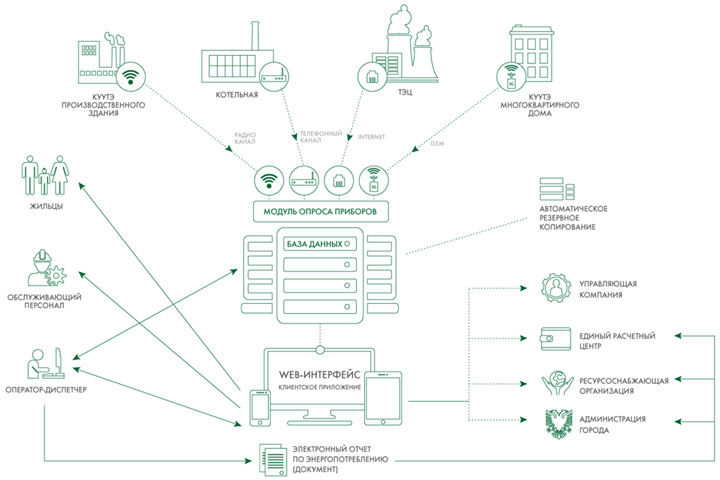 Автоматизированный коммерческий учет всех энергоресурсов на базе любых приборов учета тепла, газа, холодной и горячей воды, пара, электрической энергии, сточных вод.